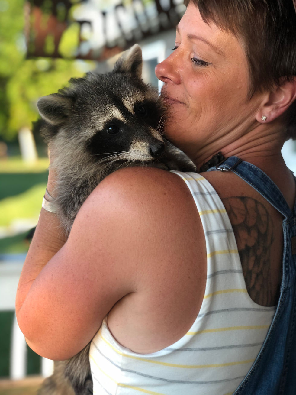 Fun fact, the raccoon in this picture was a release from last season! We got her when she was just a couple of weeks old, and now she has her own babies running around the farm!
